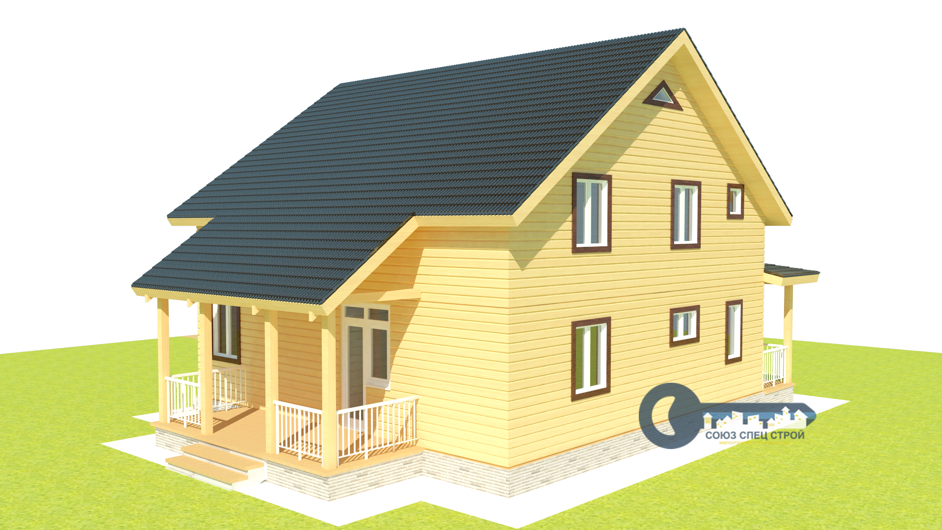 Фронтоны: Брус (сосна) 200х150 мм строганный с двух сторон со снятием фаски, естественной влажности, укладывается на межвенцовый утеплитель (джут) в один слой и крепится деревянным шкантом. Толщина стен 200 мм. Стены не обшиваются.