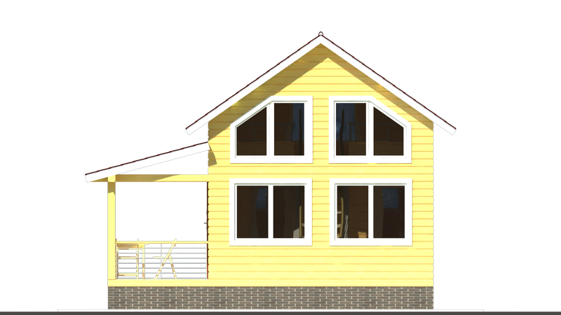 Фронтоны: брус (сосна) 150х150 мм строганный с двух сторон со снятием фаски, естественной влажности, укладывается на межвенцовый утеплитель (джут) в один слой и крепится деревянным шкантом. Толщина стен 150 мм. Стены не обшиваются.