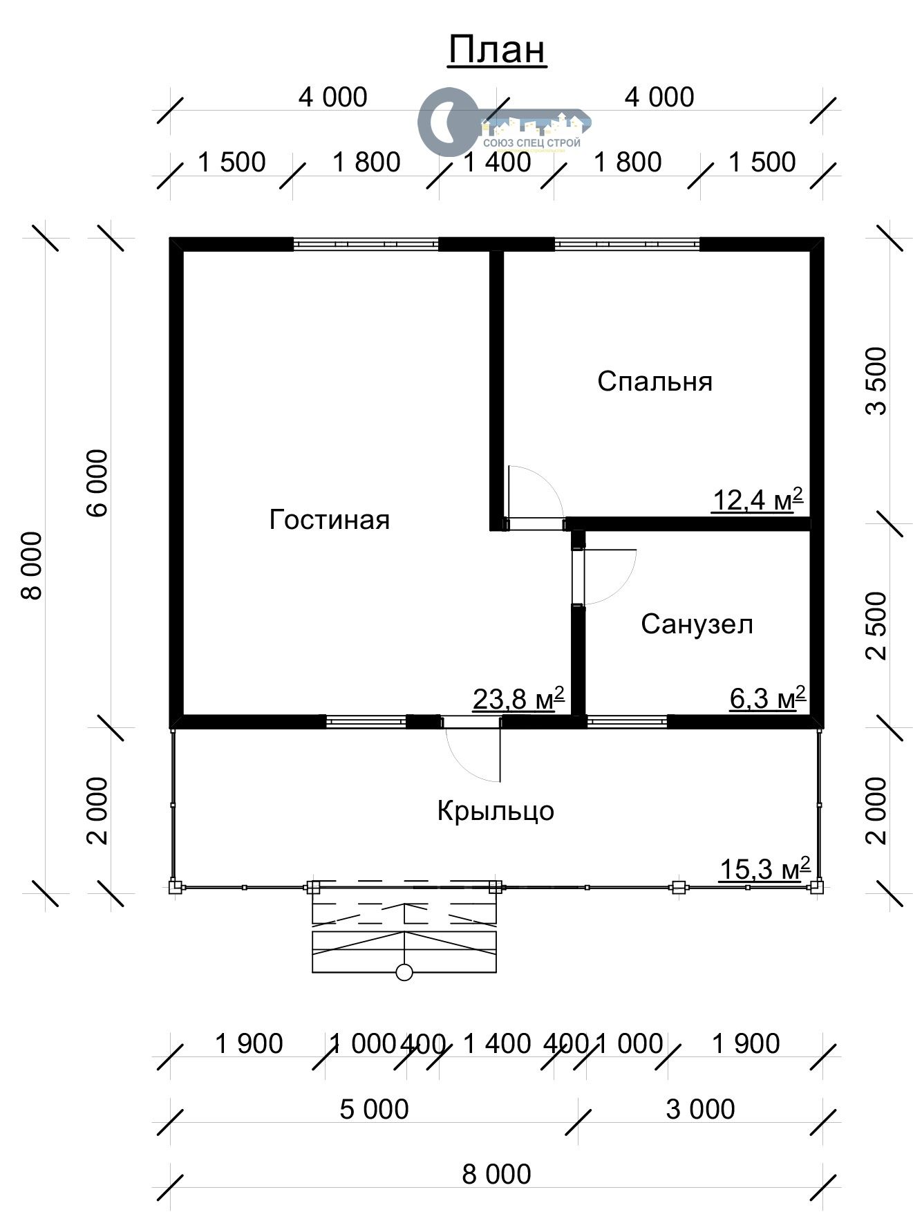 Д-17 ДАЧНЫЙ ДОМ ИЗ БРУСА:ГАБАРИТНЫЕ РАЗМЕРЫ: (8Х8М), ОБЩАЯ ПЛОЩАДЬ: 64М²
