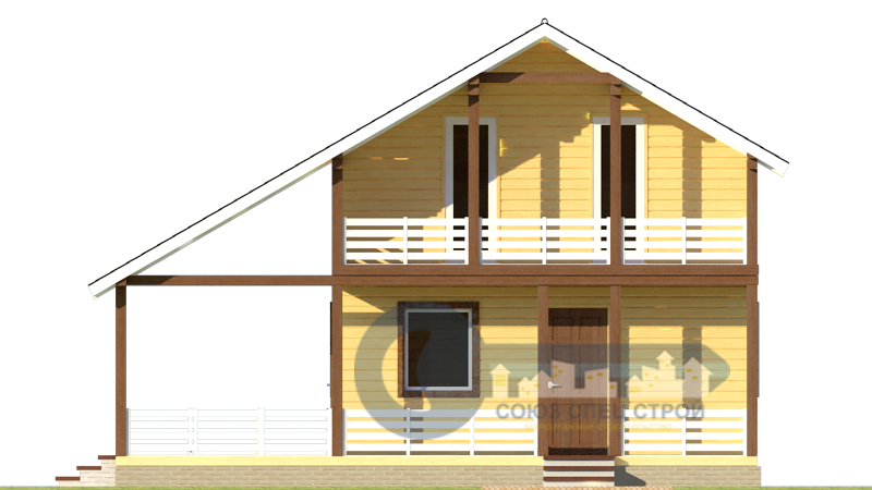 Фронтоны: Брус (сосна) 200х150 мм строганный с двух сторон со снятием фаски, естественной влажности, укладывается на межвенцовый утеплитель (джут) в один слой и крепится деревянным шкантом. Толщина стен 200 мм. Стены не обшиваются.