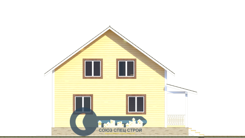 Фронтоны: Брус (сосна) 200х150 мм строганный с двух сторон со снятием фаски, естественной влажности, укладывается на межвенцовый утеплитель (джут) в один слой и крепится деревянным шкантом. Толщина стен 200 мм. Стены не обшиваются.