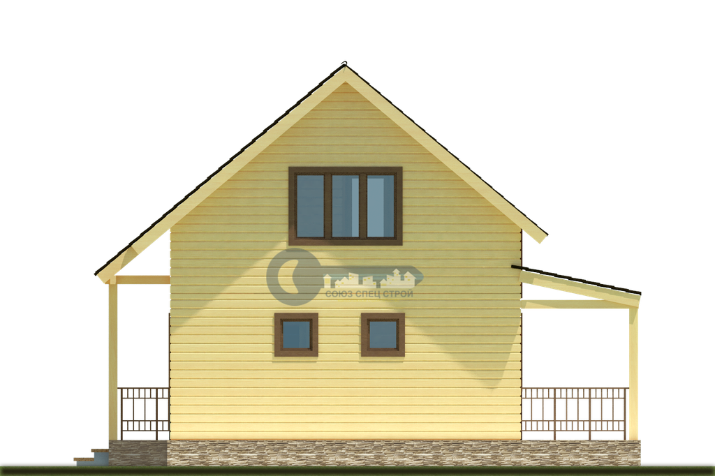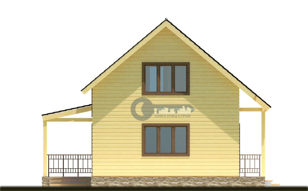 Фронтоны: Брус (сосна) 200х150 мм строганный с двух сторон со снятием фаски, естественной влажности, укладывается на межвенцовый утеплитель (джут) в один слой и крепится деревянным шкантом. Толщина стен 200 мм. Стены не обшиваются.