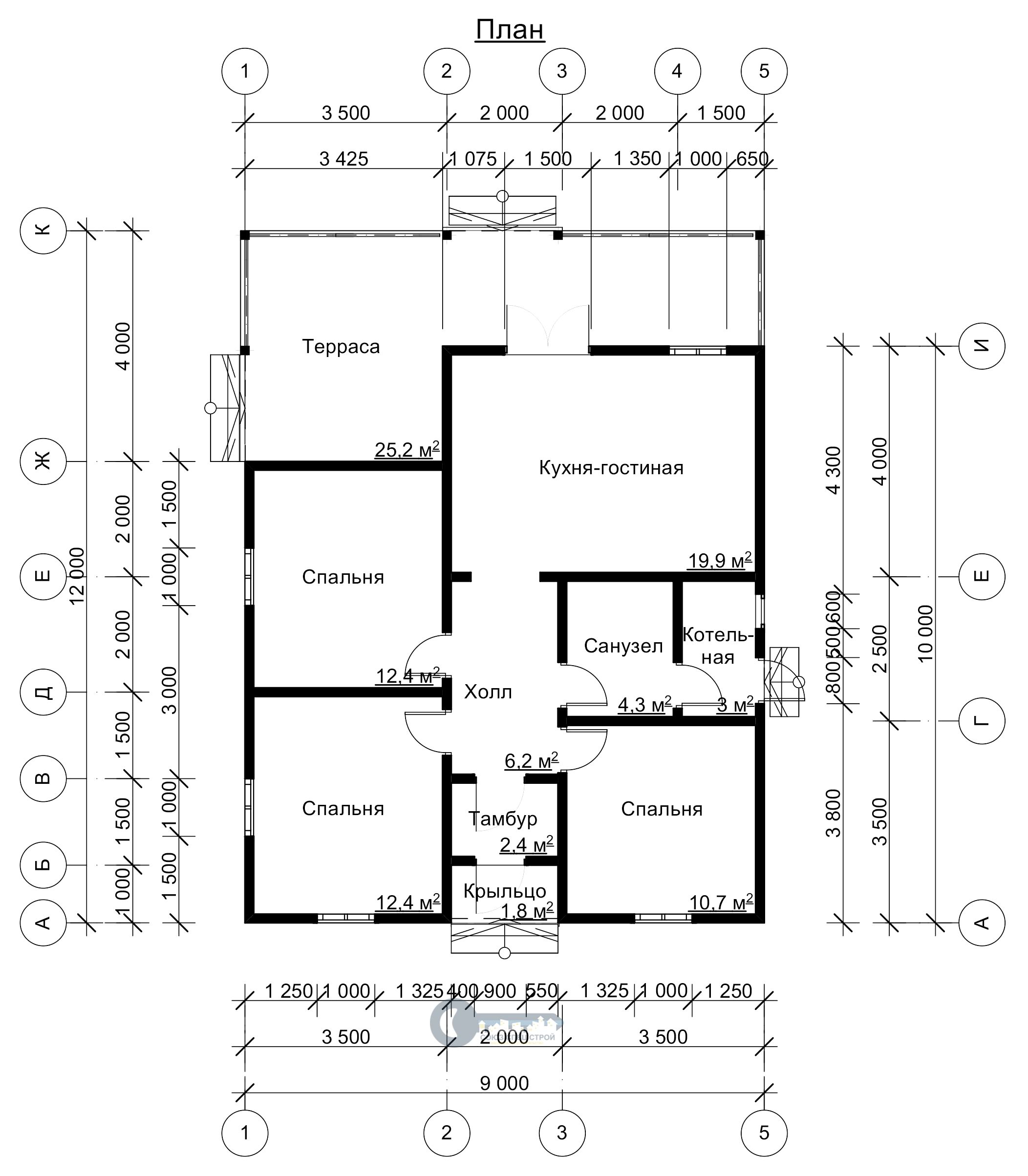 ДЖ-12 ГАБАРИТНЫЕ РАЗМЕРЫ: (9Х12М) 1 ЭТАЖ, ОБЩАЯ ПЛОЩАДЬ: 108М²