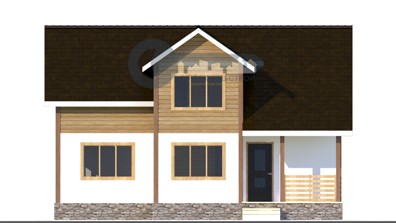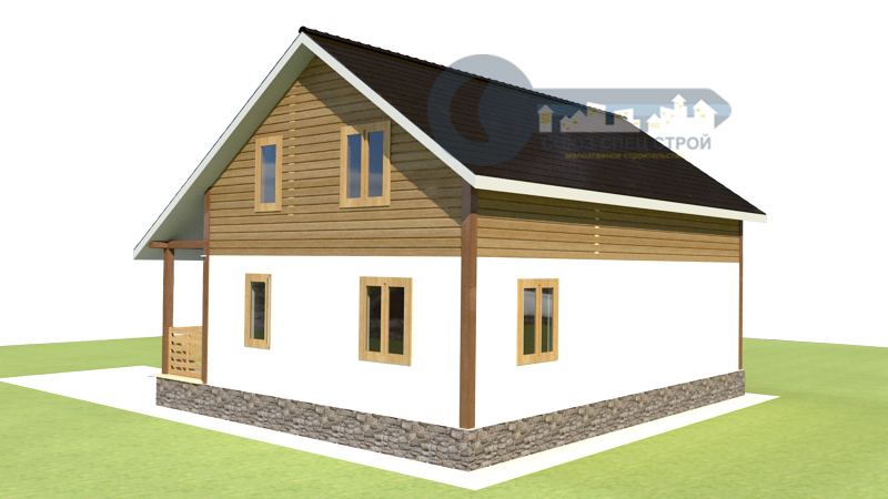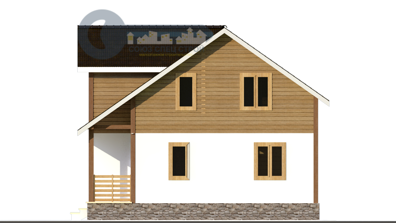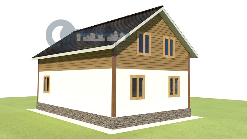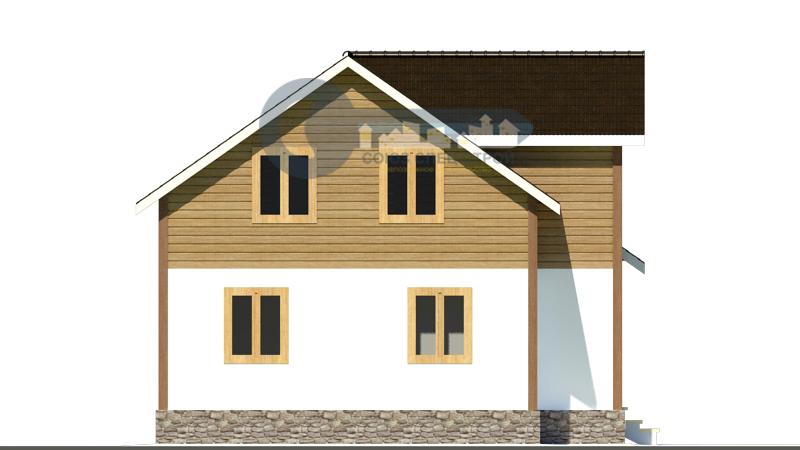 Фронтоны: Брус (сосна) 200х150 мм строганный с двух сторон со снятием фаски, естественной влажности, укладывается на межвенцовый утеплитель (джут) в один слой и крепится деревянным шкантом. Толщина стен 200 мм. Стены не обшиваются.