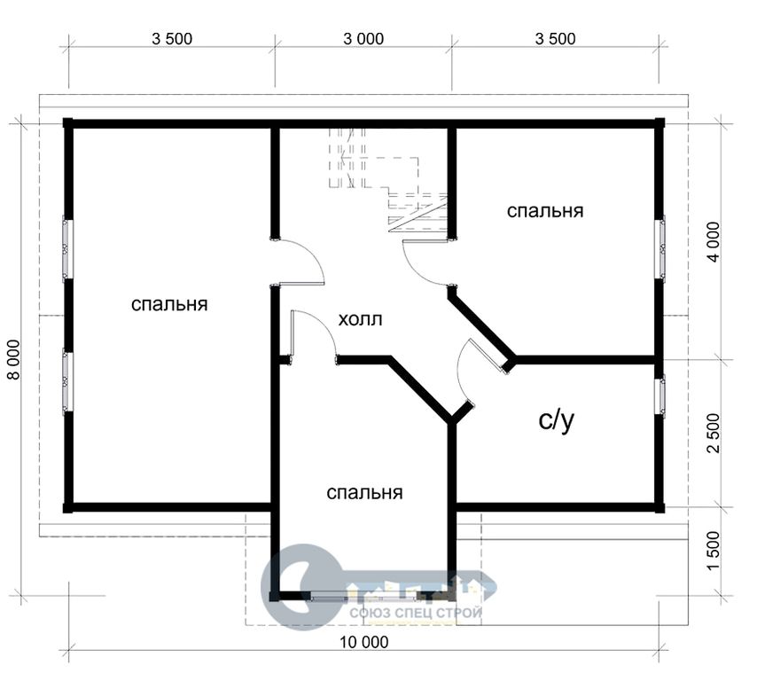 Перегородки: Брус (сосна) 150х150 мм строганный с двух сторон со снятием фаски, естественной влажности, укладывается на межвенцовый утеплитель (джут) в один слой и крепится деревянным шкантом. Толщина стен 150 мм. Стены не обшиваются.