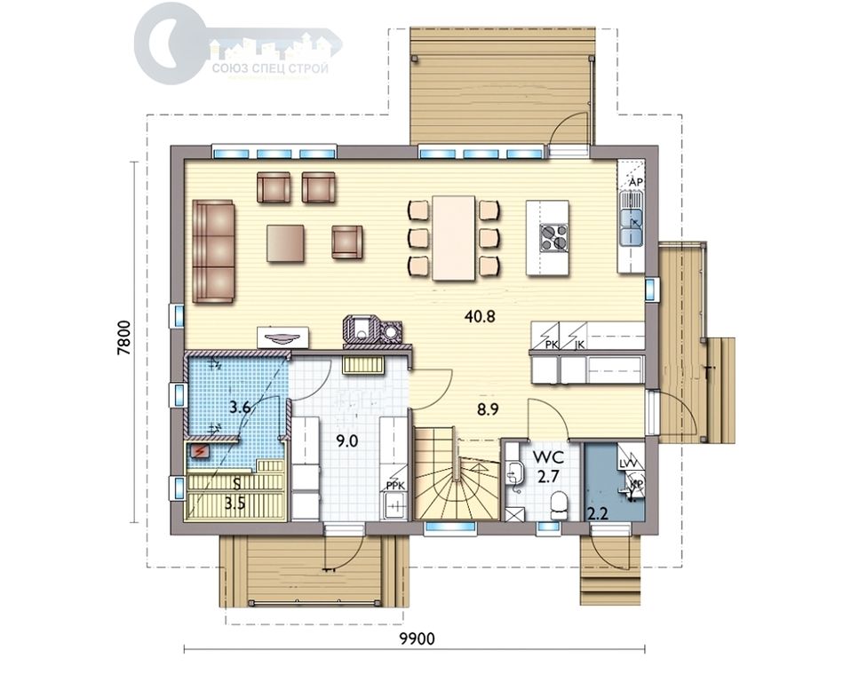 Веранда: высота - 2.25 м, общая крыша с домом, внешний вид согласно визуальной картинке.