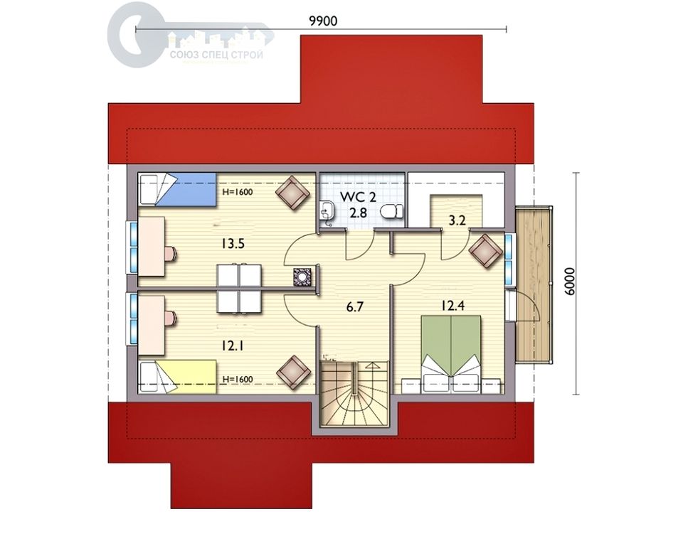Крыша двускатная, основной конёк по центральной оси здания.